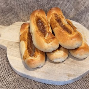 Voor de zoet-liefhebbers hebben we een roomboterkorst in de vorm van een worstenbroodje. Dit ‘broodje’ is gevuld met een mix van gele room, appeltjes en rozijnen.